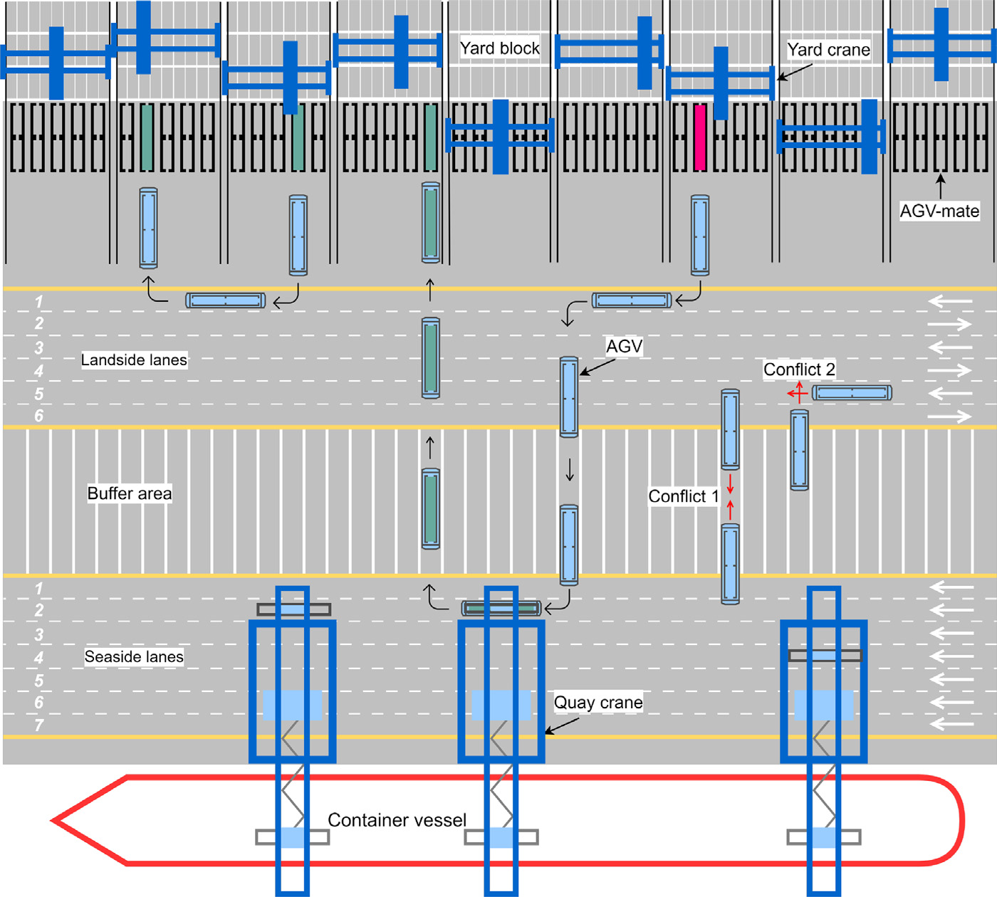 اما چالش فقط در سطح نرمافزاری نیست. از منظر عملیاتی، هماهنگی همزمان بین دهها ربات متحرک با جرثقیلهای چندگانهی فعال یکی از پیچیدهترین مسائل در مهندسی لجستیک است. هر جرثقیل در زمان مشخصی برای تخلیه یا بارگیری آماده میشود، و اگر ربات در آن لحظه در محل نباشد، ظرفیت عملیاتی از بین میرود. از سوی دیگر، اگر چند ربات همزمان به یک جرثقیل برسند، ازدحام و توقف ایجاد میشود. این تداخلات باعث میشوند تا زمانهای بیکار جرثقیلها افزایش یافته و کل راندمان بندر کاهش پیدا کند.