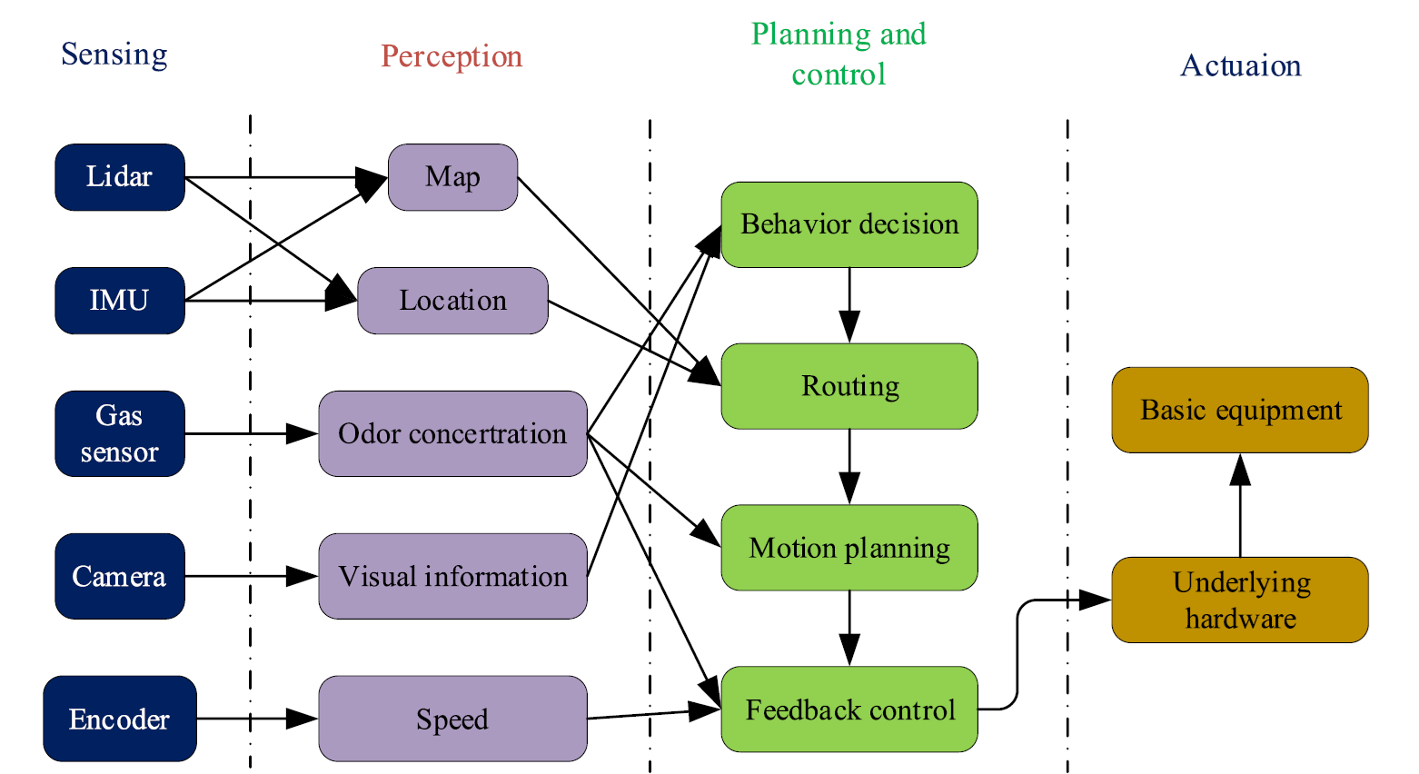 در این سیستم، اطلاعات مکانیابی از طریق لایدار، IMU و انکودر ترکیب میشود تا ربات موقعیت خود را دقیق بداند. سپس حسگرهای بویایی در محور عمودی نصب شدهاند تا تغییر غلظت گاز در ارتفاعهای مختلف را شناسایی کنند. اطلاعات بینایی نیز برای تشخیص الگوهای رنگی و بصری مرتبط با نشت مورد استفاده قرار میگیرد. این دو منبع داده با معماری تصمیمگیری موسوم به Subsumption Architecture با هم ترکیب میشوند تا ربات بتواند در هر لحظه تصمیم بگیرد: به کجا برود، چه رفتاری را انجام دهد، و چه زمانی متوقف شود.